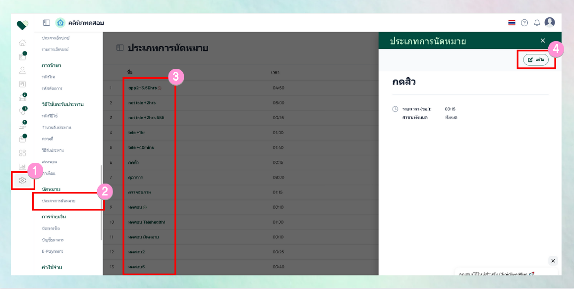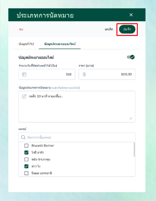 ในส่วนนี้จะเป็นการตั้งค่าการจองนัดหมายออนไลน์ ผู้ใช้งานสามารถตั้งค่าประเภทการนัดหมายที่จะแสดงในการจองนัดหมายออนไลน์ได้ ตามขั้นตอนนี้