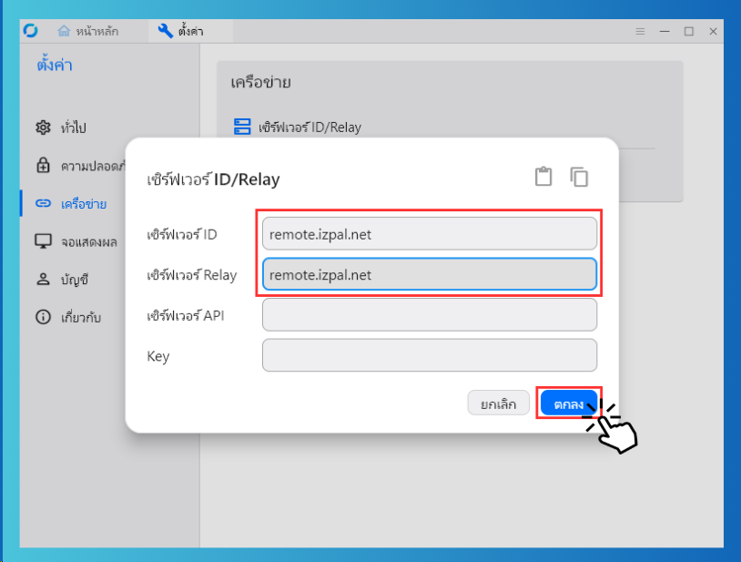 - ตั้งค่า เซิร์ฟเวอร์ ID และ เซิร์ฟเวอร์ Reply เป็น remote.izpal.net