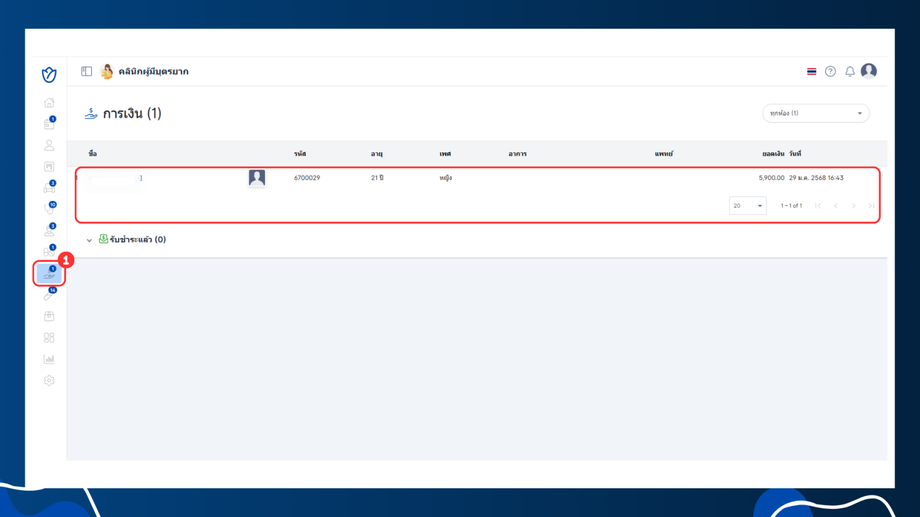 - เมื่อผู้ใช้งานคลิกเข้ามาที่ห้องการเงิน ระบบจะแสดงชื่อคนไข้ที่ถูกส่งคิวมาที่ห้องการเงิน