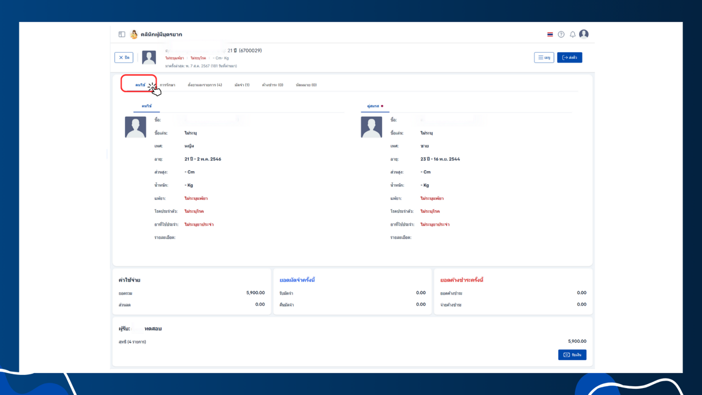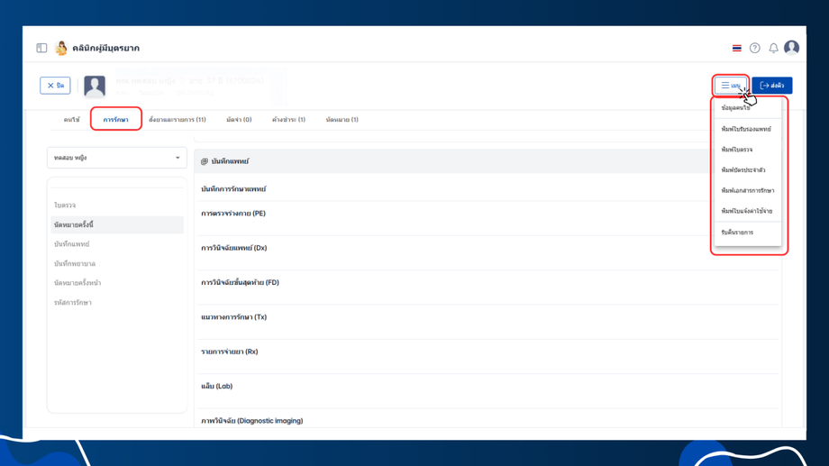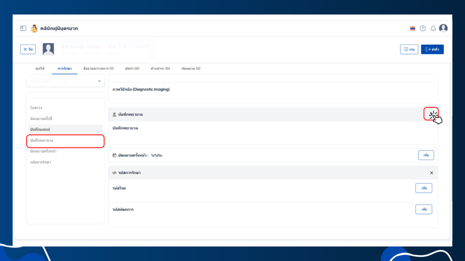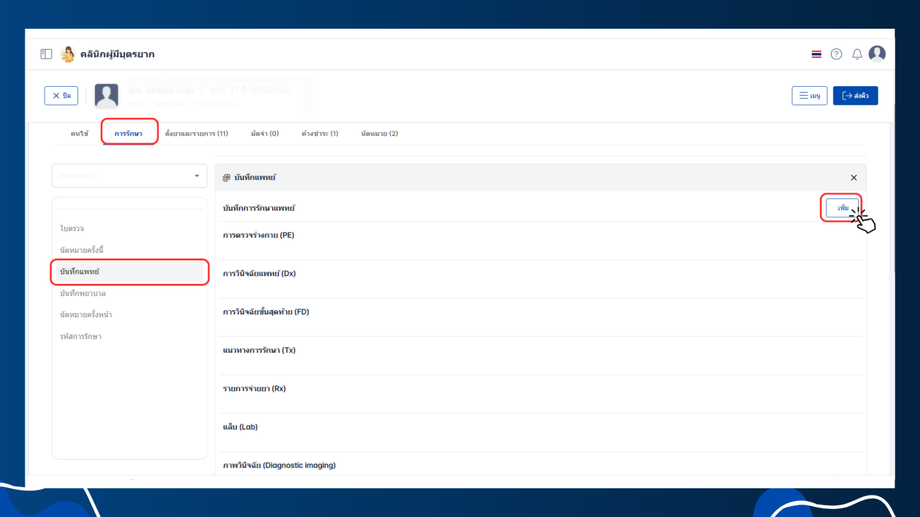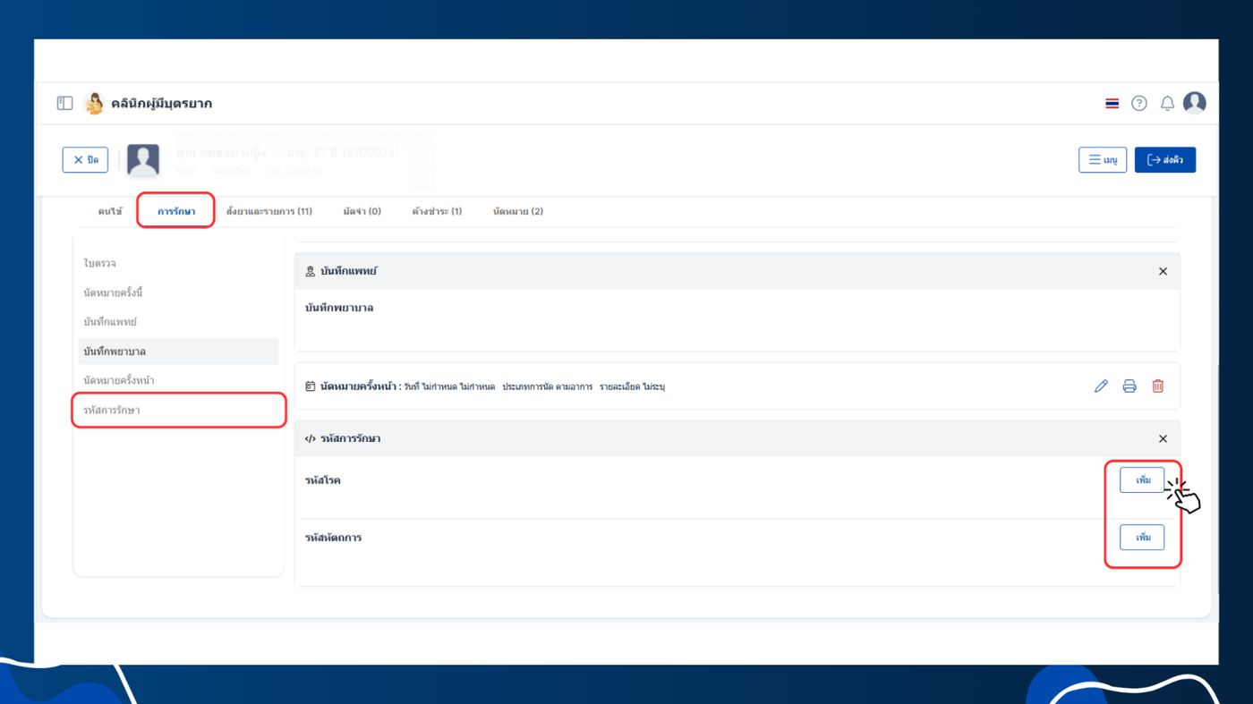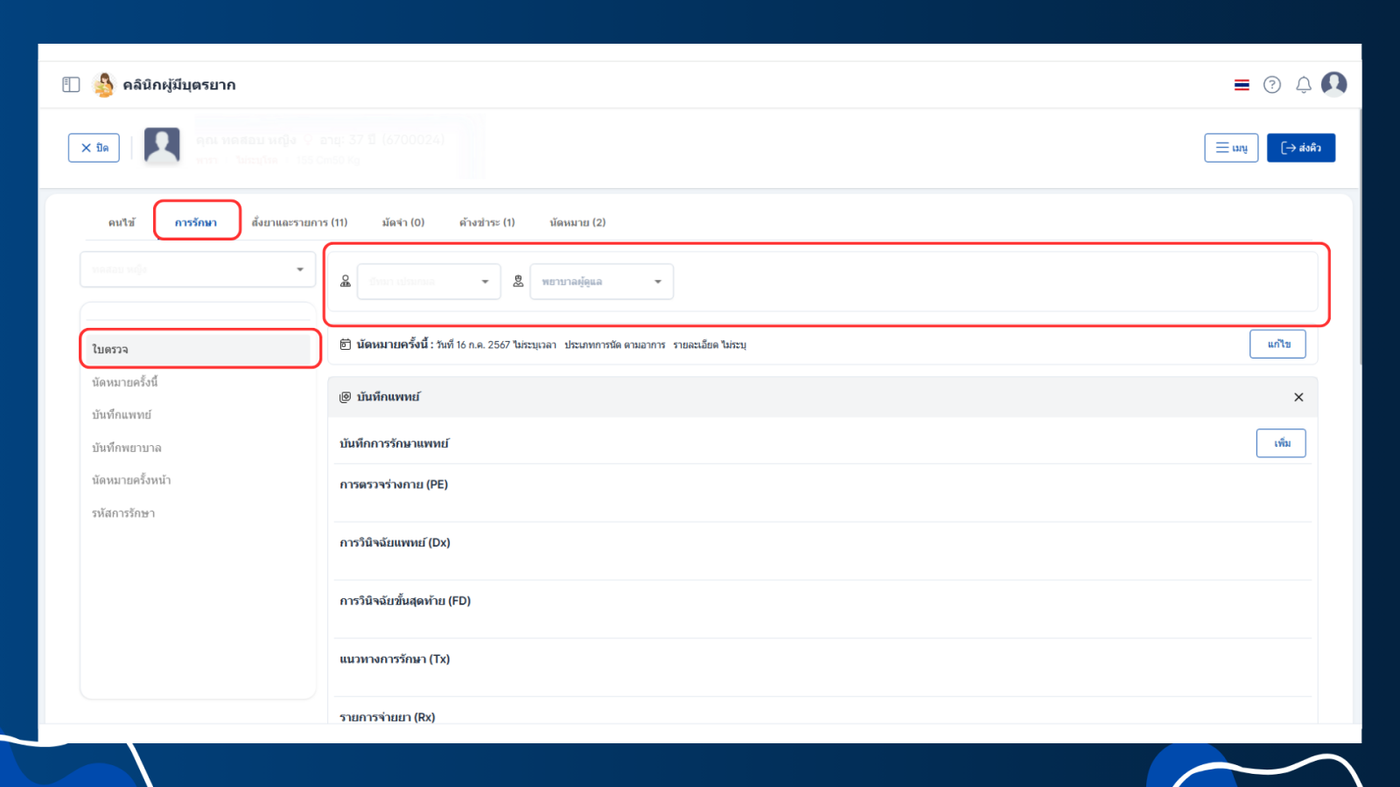 - คนไข้ ชื่อคนไข้จะแสดงขึ้นอัตโนมัติ