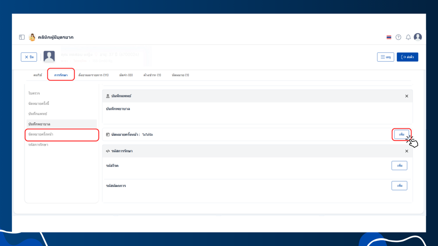 การนัดหมายครั้งหน้าที่จะเข้าพบแพทย์เพื่อทำการตรวจรักษาหรือติดตามอาการของคนไข้ คลิกที่ เพิ่ม