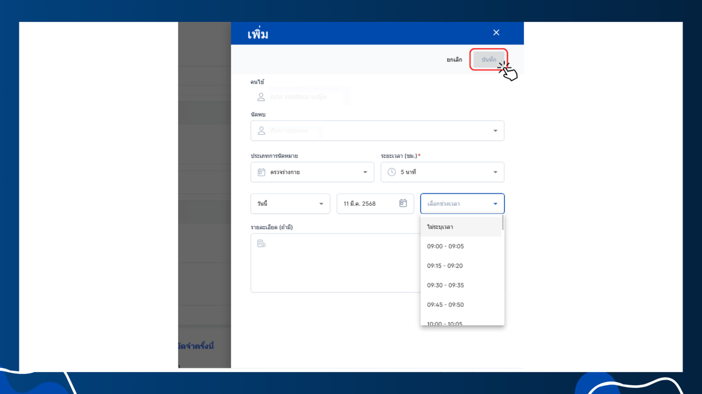 - ช่วงเวลา เลือกช่วงเวลาที่จะเข้าพบ