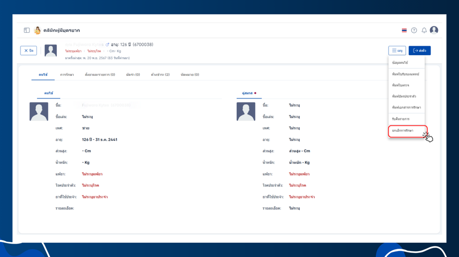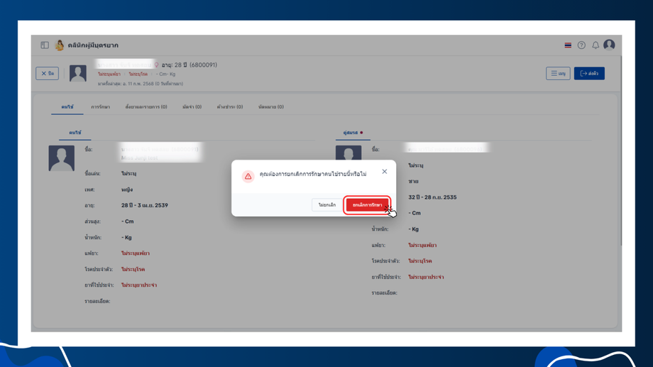 - เลือกคนไข้ที่ต้องการยกเลิกการรักษา คลิกที่ชื่อคนไข้