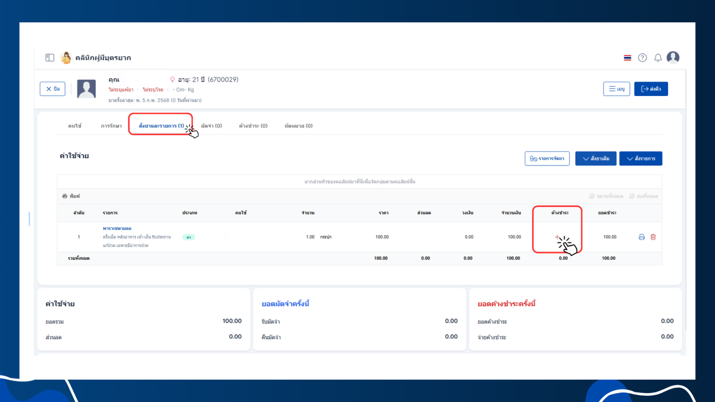 - เมื่อผู้ใช้งานสั่งรายการแล้วในหัวข้อสั่งยาและรายการ ผู้ใช้งานคลิกที่ค้างชำระเพื่อทำรายการค้างชำระ