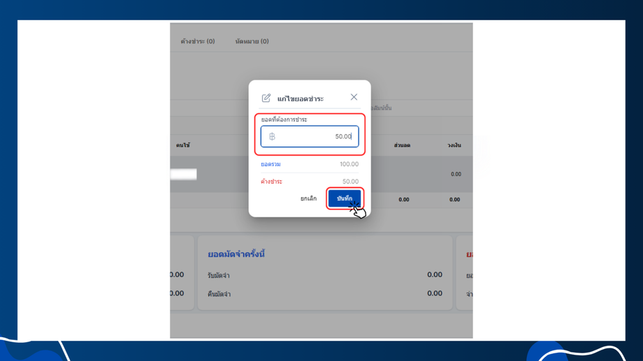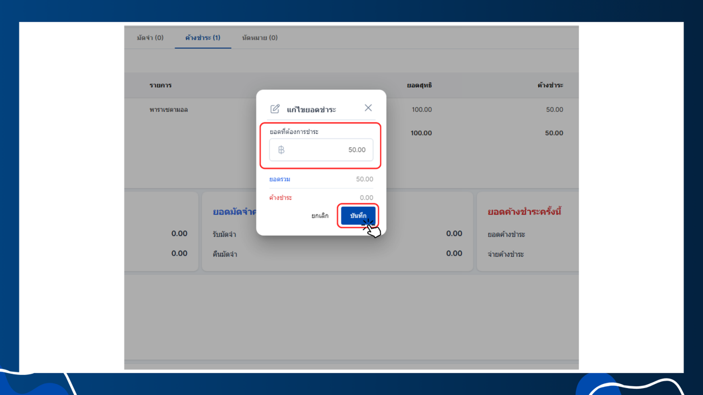 ใส่จำนวนเงินยอดที่ต้องการชำระ ระบบจะคำนวณยอดค้างชำระ จากนั้นกดบันทึก