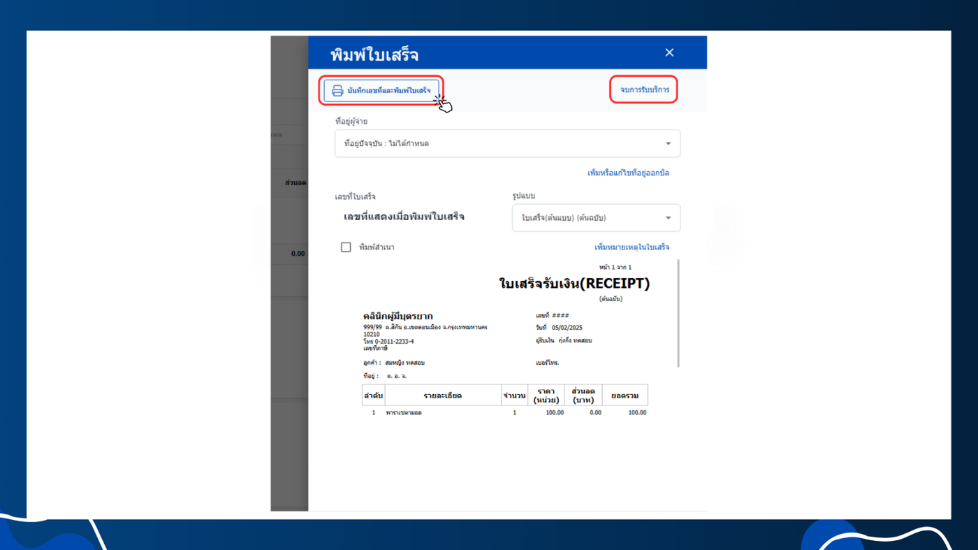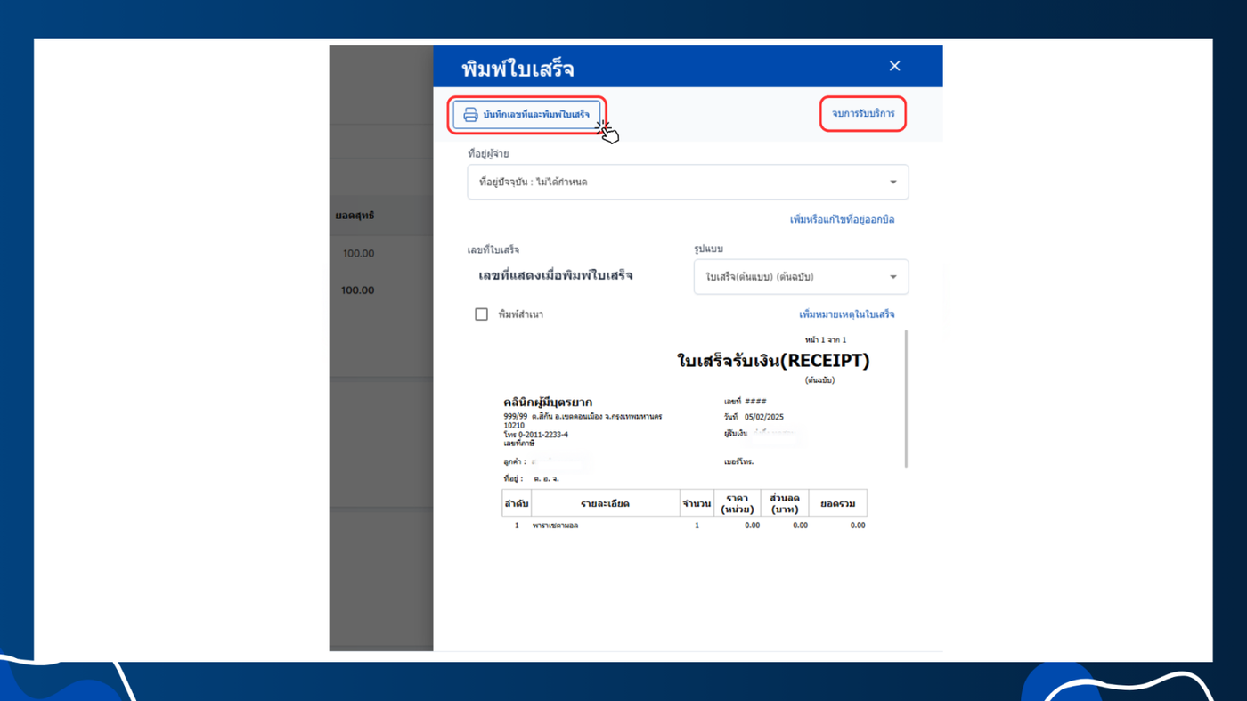 - เมื่อดำเนินการตามขั้นตอนเสร็จเรียบร้อยแล้วหรือไม่ต้องการสั่งพิมพ์ใบเสร็จสามารถกดจบบริการด้านขวาบนได้เลย