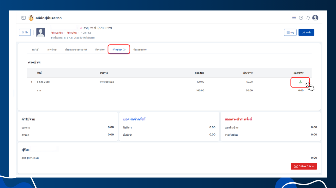 - เมื่อคนไข้เข้ามาทำการอีกครั้ง ในเมนูการเงิน หัวข้อค้างชำระ ระบบจะแสดงรายการค้างชำระ ผู้ใช้งานจะสามารถคลิกที่ไอคอนรูปมือสีเขียวเพื่อจ่ายยอดค้างชำระ