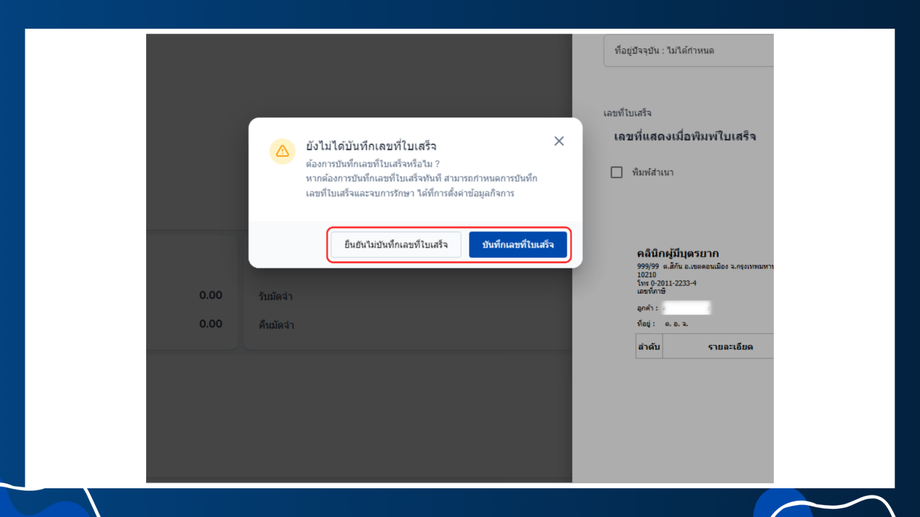 - สามารถคลิกเลือก ยืนยันไม่บันทึกเลขที่ใบเสร็จ บันทึกเลขที่ใบเสร็จ