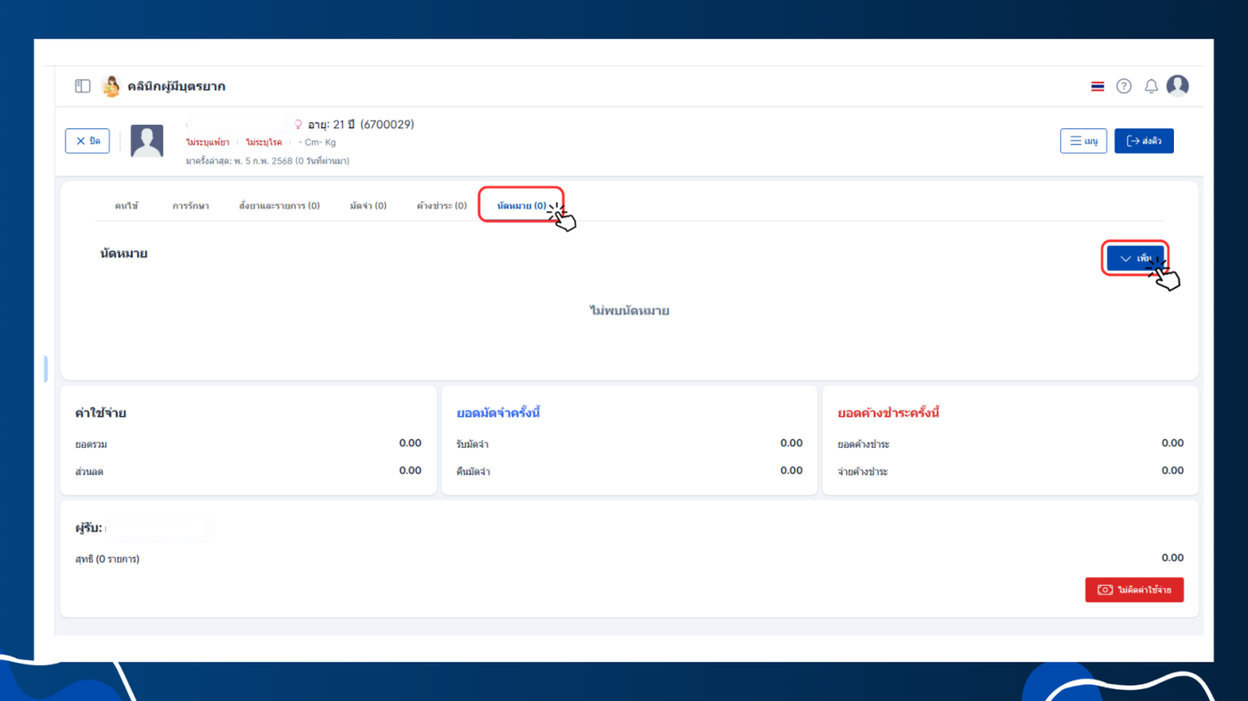 ผู้ใช้งานสามารถทำนัดหมายกับคนไข้ได้ผ่าน หัวข้อนัดหมายในห้องการเงินคลิกที่เพิ่ม