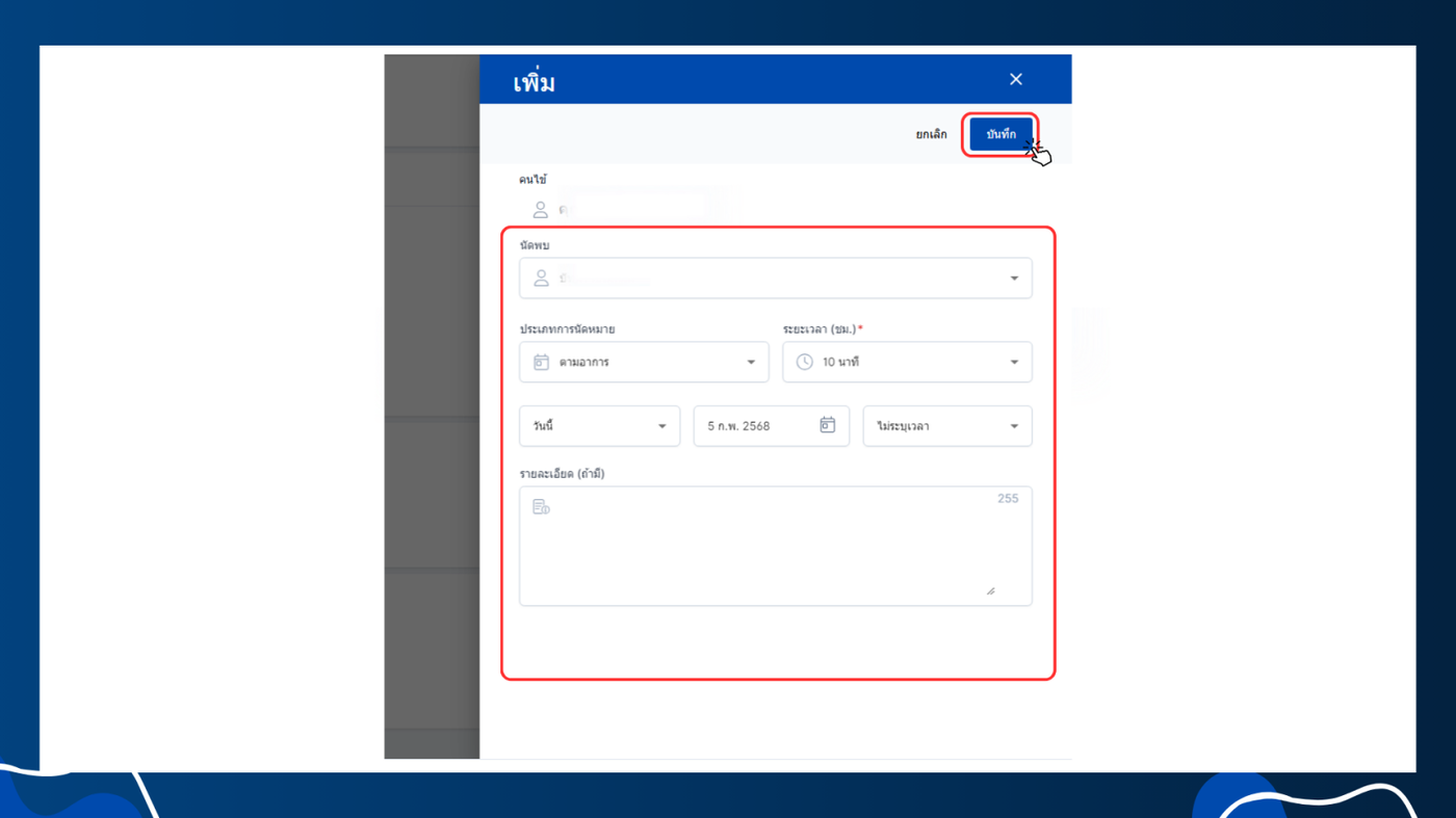 - เพิ่มนัดหมายสามารถคลิกที่เพิ่ม