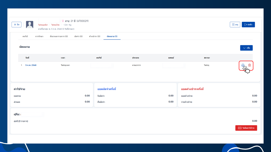 - สามารถพิมพ์ใบนัดหมายได้จากไอคอนรูป เครื่องพิมพ์