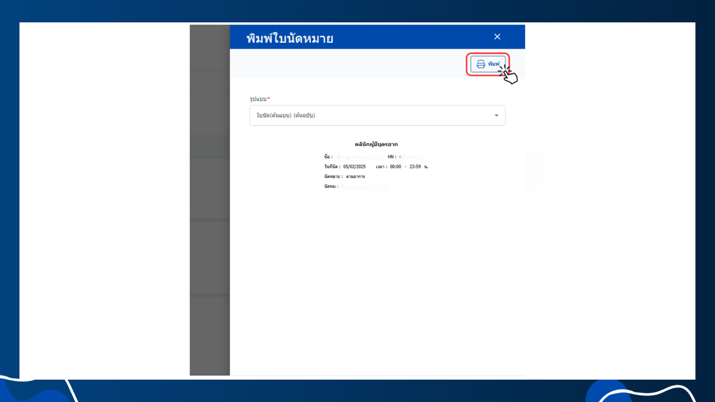 - คลิกที่พิมพ์ เพื่อทำการพิมพ์ใบนัดหมาย