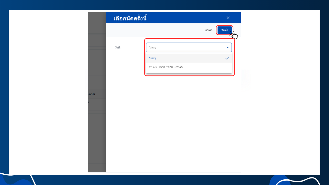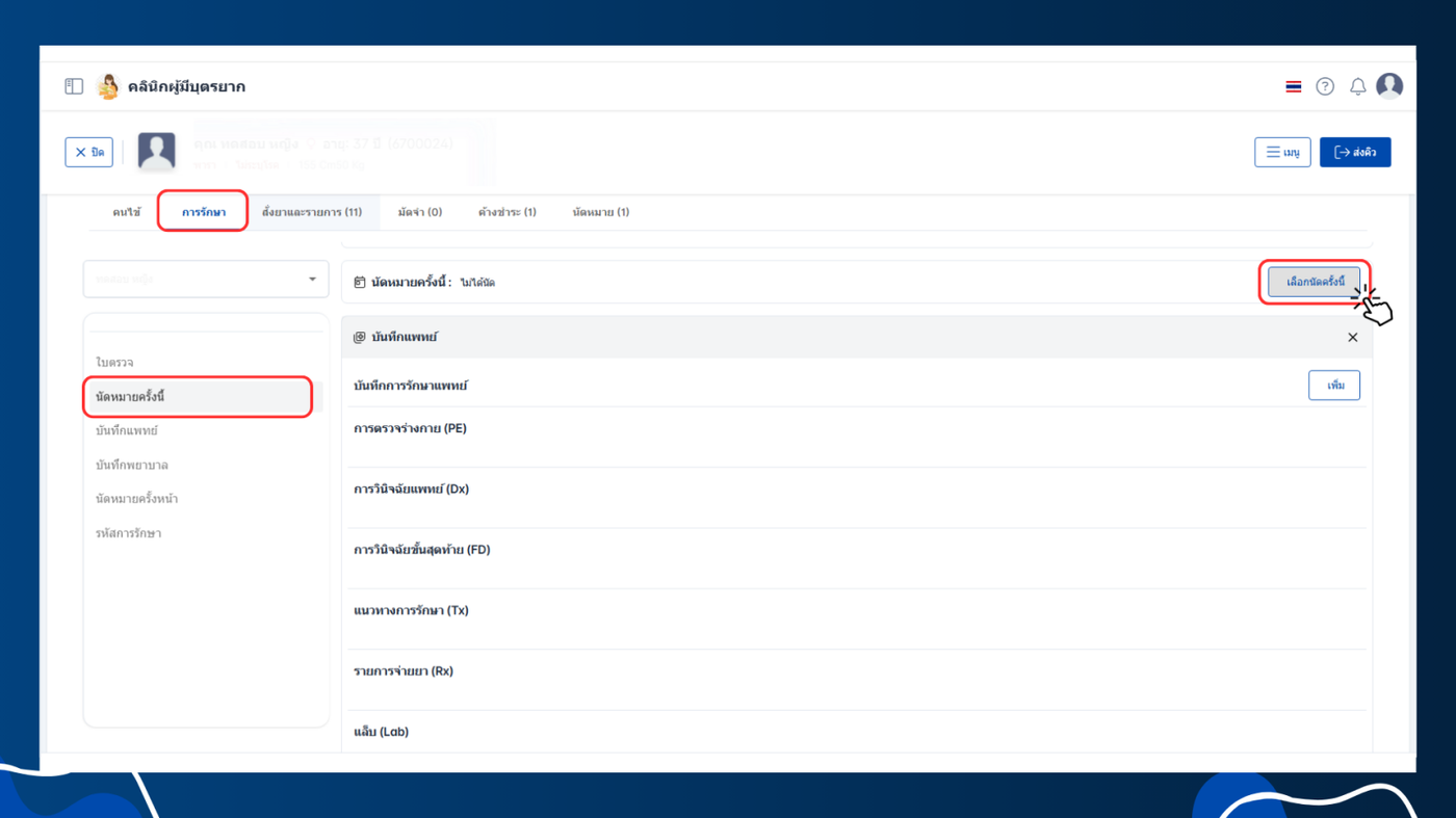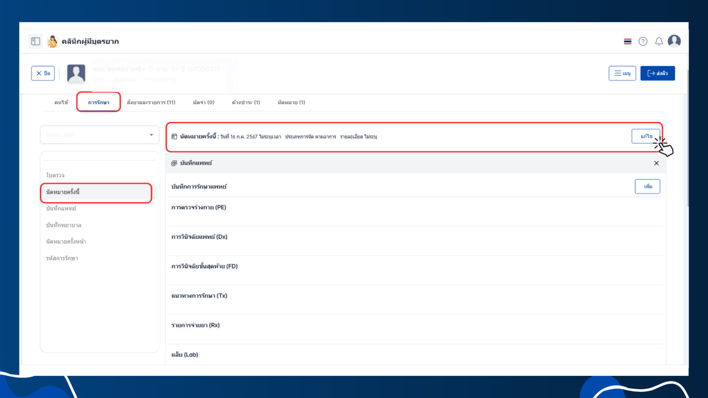 - คลิกเลือกนัดหมายครั้งนี้ : ระบุได้จากข้อมูลที่มาจากการเพิ่มนัดหมายไว้ล่วงหน้าที่หน้านัดหมายและสามารถแก้ไขได้