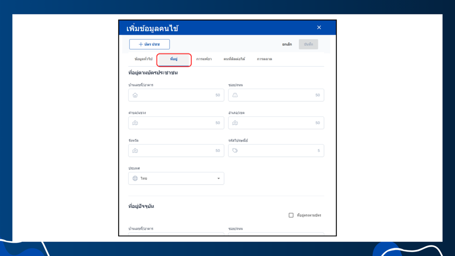 - ระบบจะทำการคีย์ข้อความในช่อง"ข้อมูลทั่วไป"และ"ที่อยู่"ให้โดยอัตโนมัติ