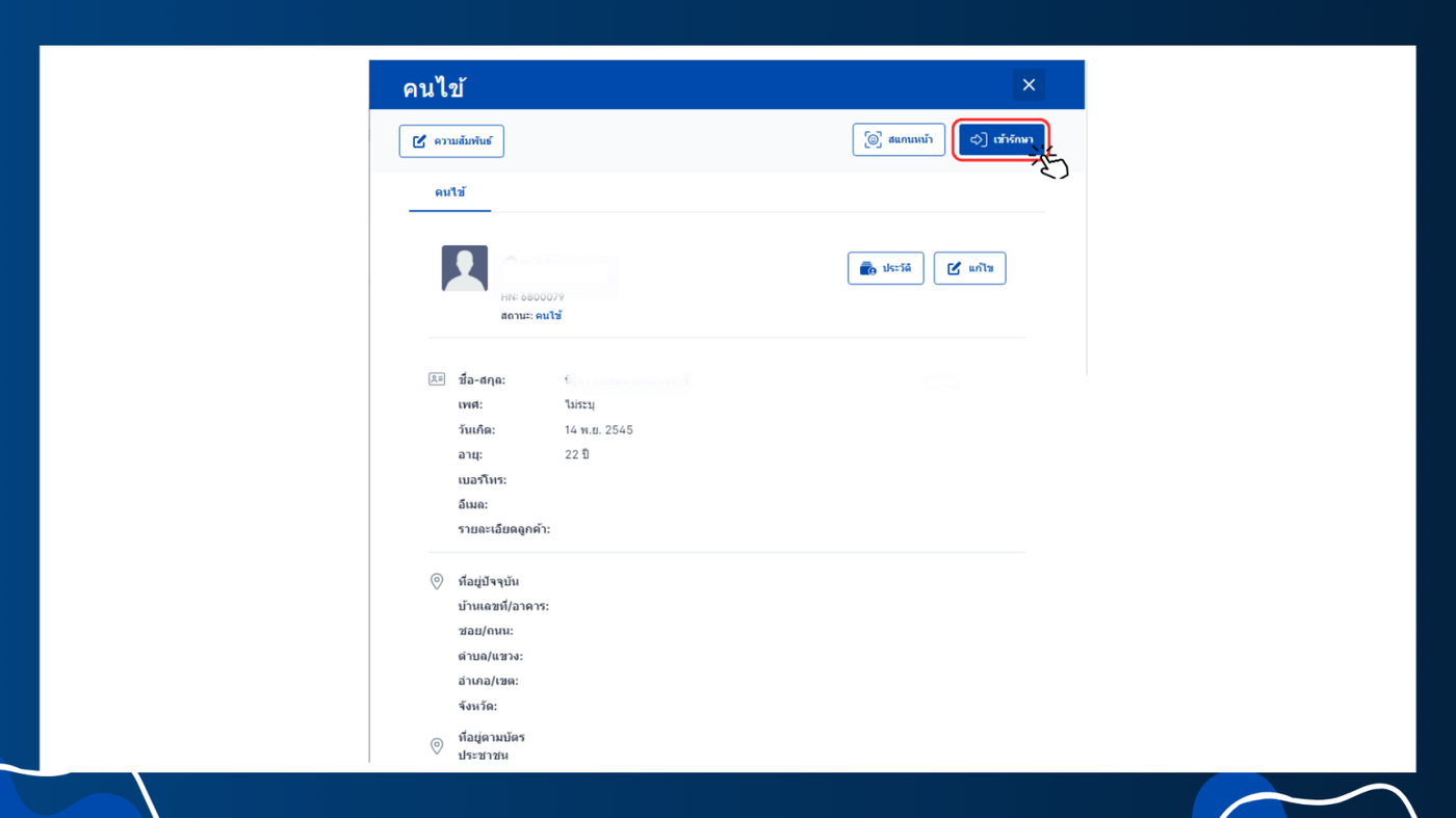 - เมื่อค้นหาคนไข้สำเร็จจากนั้นเลือกคลิกที่ชื่อคนไข้ จะมีหน้าต่างแสดงข้อมูลคนไข้ คลิก เข้ารักษา