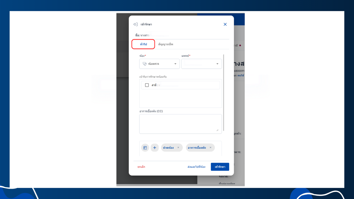 - เข้ารักษาแท็บทั่วไป เลือกห้องที่จะเข้ารับการรักษา เลือกแพทย์ที่ต้องการเข้ารับการรักษา สามารถเลือกได้ว่าจะเข้ารับการรักษาพร้อมกันหรือเฉพาะคนไข้ และอาการเบื้องต้น สามารถระบุอาการเบื้องต้นได้และระบุวันที่ได้ที่ไอคอนปฎิทิน