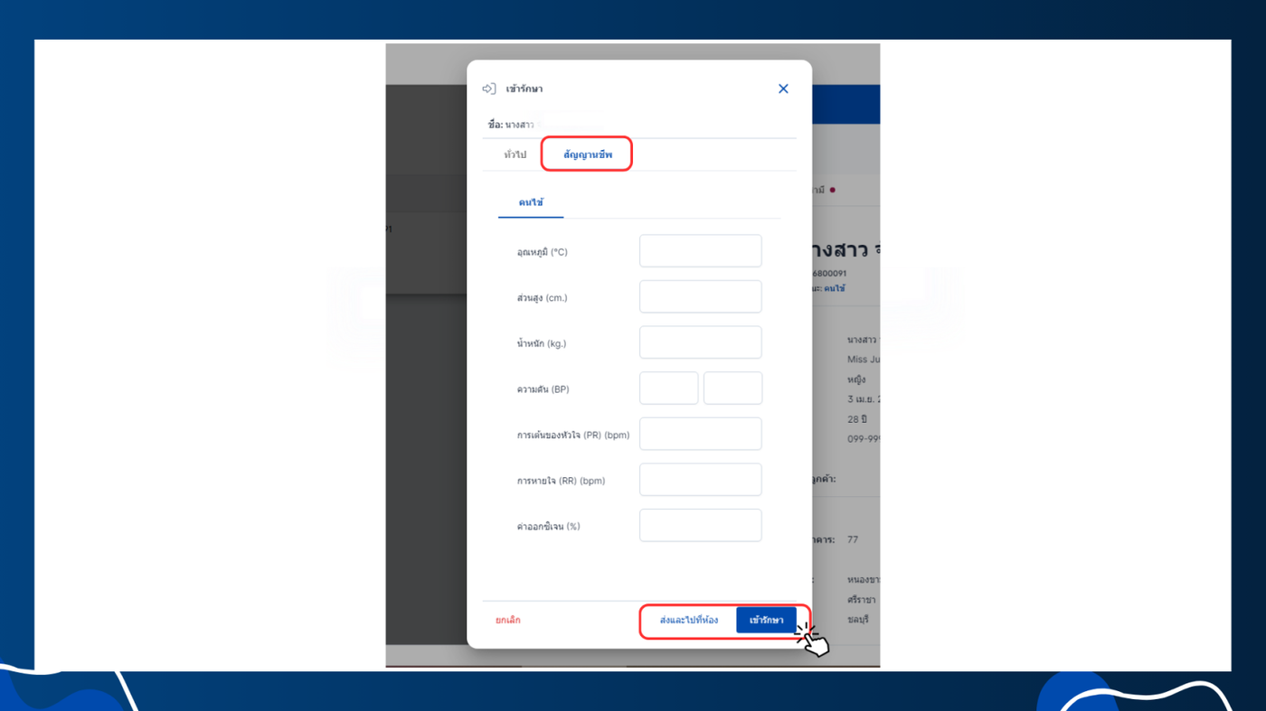- กรอก อุณหภูมิ ส่วนสูง น้ำหนัก ความดัน การเต้นของหัวใจ การหายใจ ค่าออกซิเจน