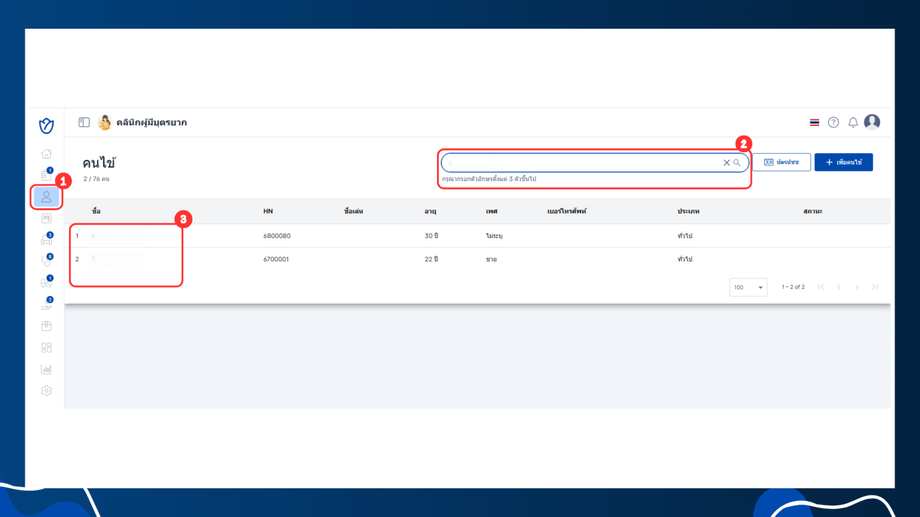 - ค้นหาคนไข้โดย พิมพ์ชื่อหรือรหัสประจำตัว หรือ เสียบบัตรประชาชน เพื่ออ่านข้อมูล (หากคนไข้ยังไม่มีประวัติข้อมูล ให้ทำการเพิ่มข้อมูลก่อน)