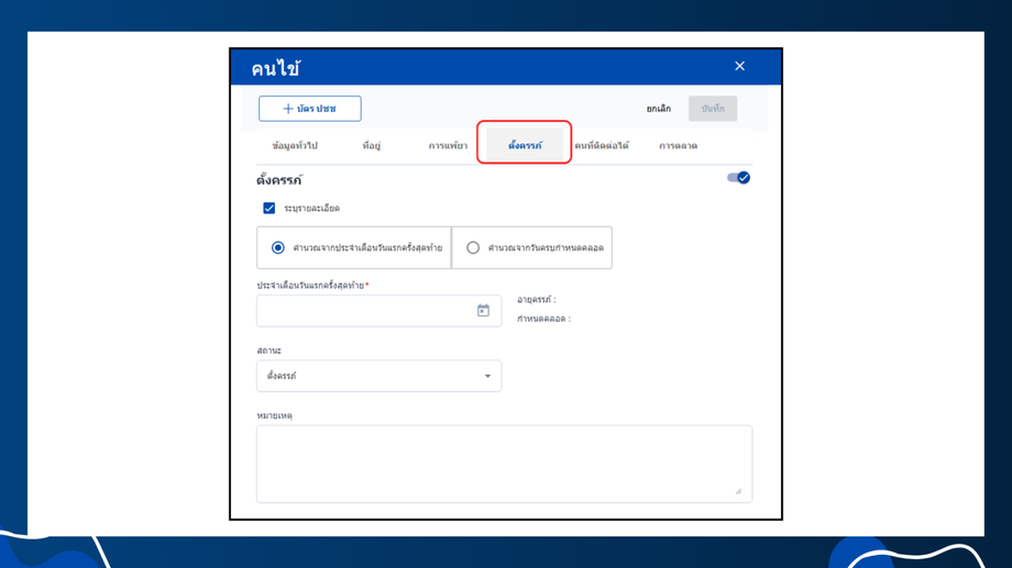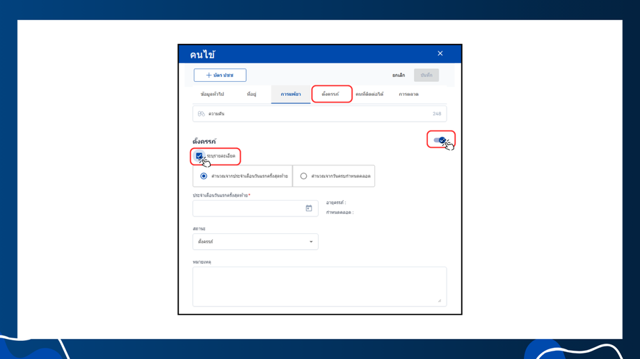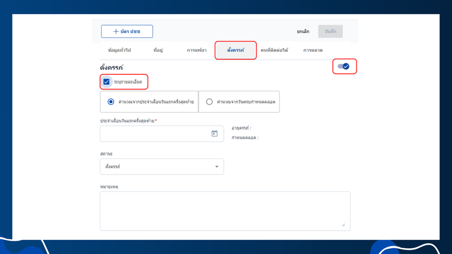 - ผู้ใช้เข้าสู่แก้ไขข้อมูลคนไข้ เลือกหัวข้อตั้งครรภ์ จะสามารถเปิด-ปิดการใช้งานการตั้งครรภ์ได้ และติ๊กเลือกระบุรายละเอียดเมื่อเปิดการใช้งานตั้งครรภ์ระบบจะแสดงการใช้งานดังนี้