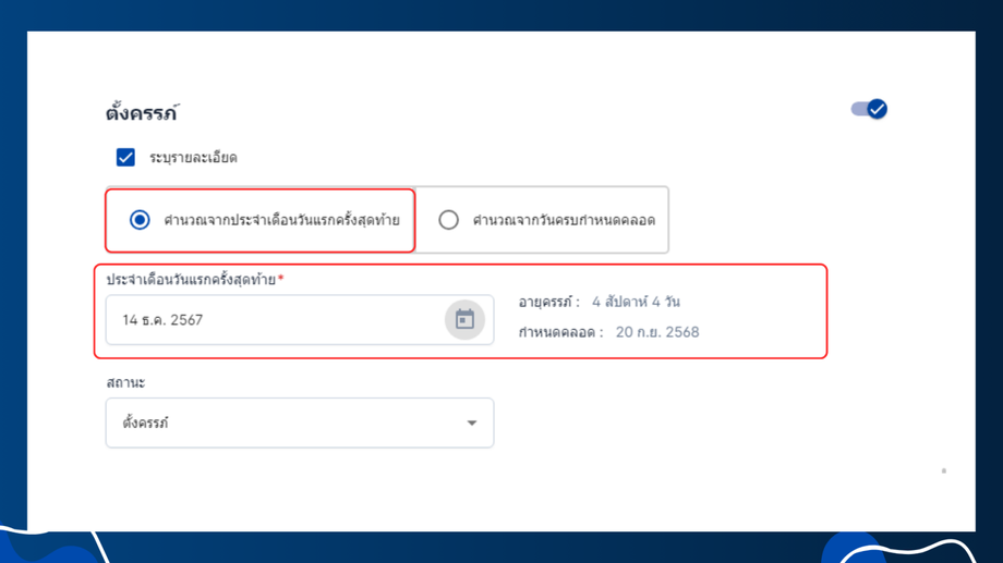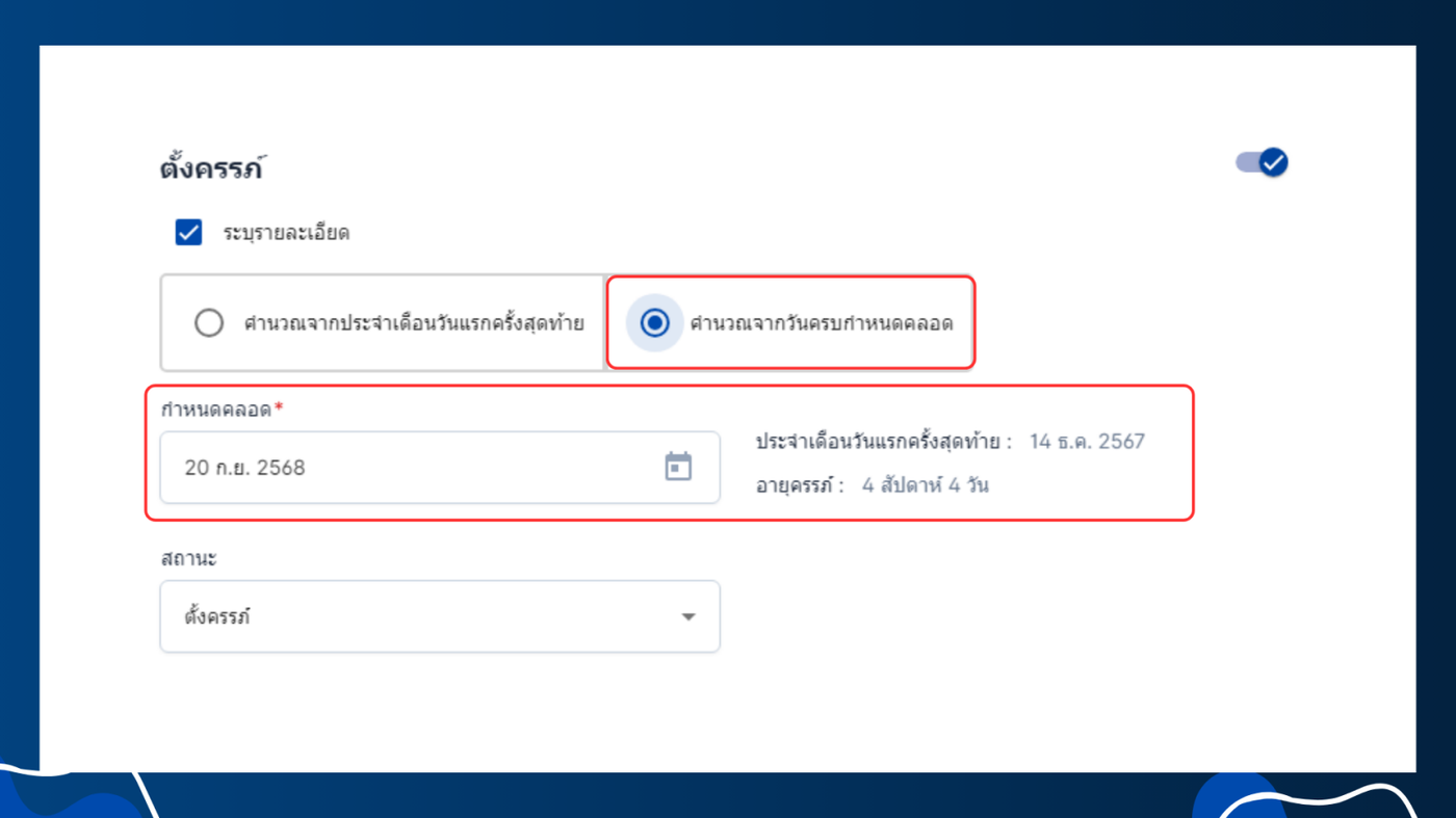 กรอกวันที่ครบกำหนดคลอด ระบบจะคำนวณ วันประจำเดือนครั้งสุดท้าย และ อายุครรภ์