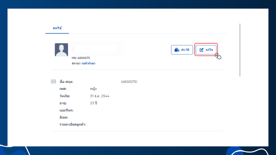 - เลือกรายการคนไข้แล้วคลิกที่แก้ไข