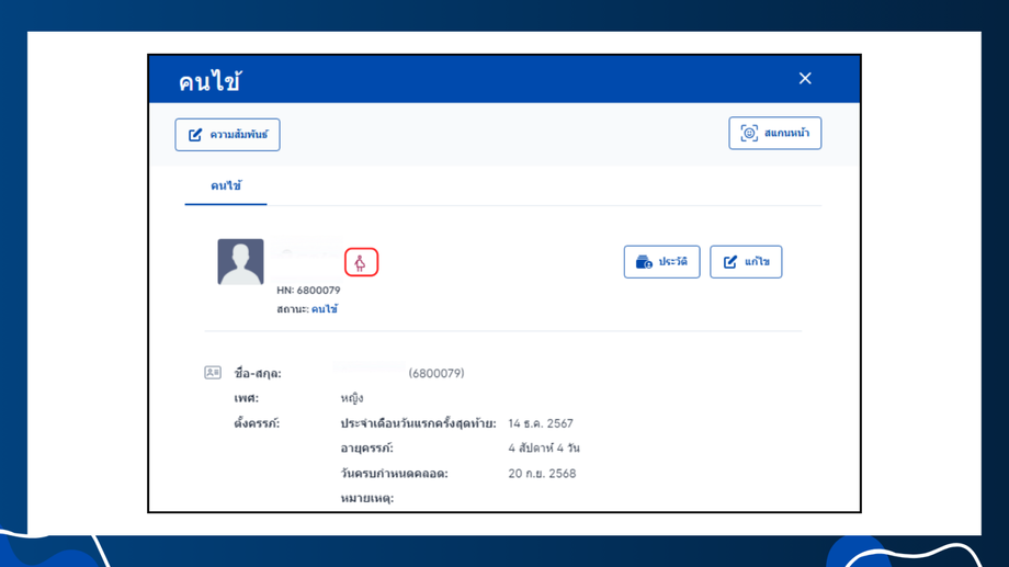 - ไอคอนจะแสดงเฉพาะกรณีคนไข้มีสถานะ ตั้งครรภ์ เท่านั้น
