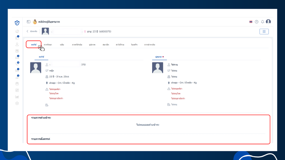 - แท็บคนไข้ : ข้อมูลส่วนตัว คู่สมรส หรือรายการค้างชำระ และ รายการตั้งครรภ์