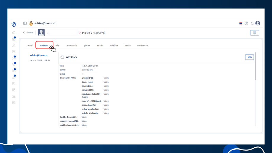 - แท็บการรักษา : ประวัติการรักษาแสดงวันที่เข้ารับการรักษาและสามาถแก้ไขข้อมูลได้