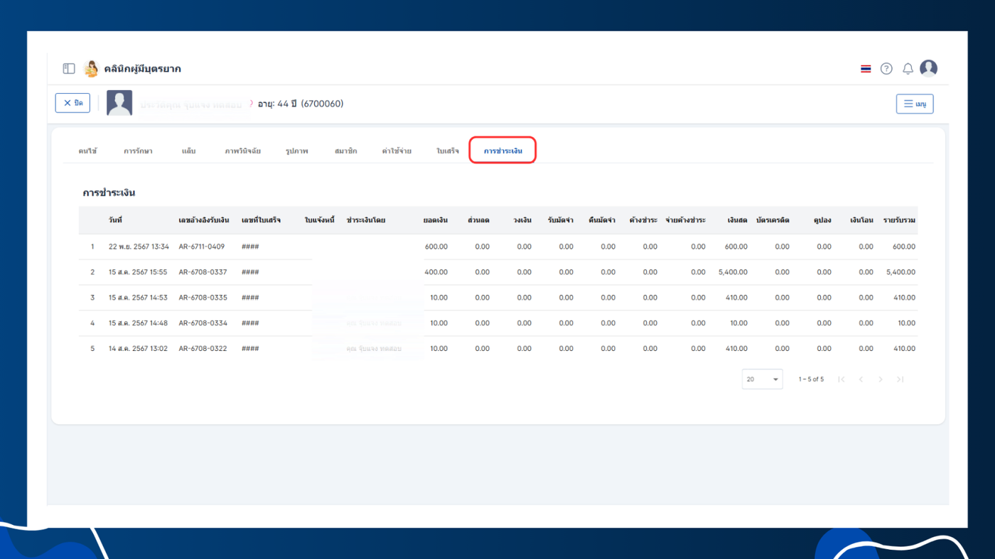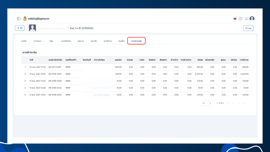 แท็บการชำระเงิน : แสดงรายละเอียดการชำระเงิน