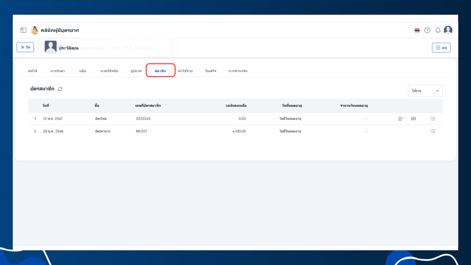 - แท็บสมาชิก : แสดงวันที่ บัตรที่ซื้อ เลขที่บบัตรสมาขิก วงเงินคงเหลือ วันที่หมดอายุ