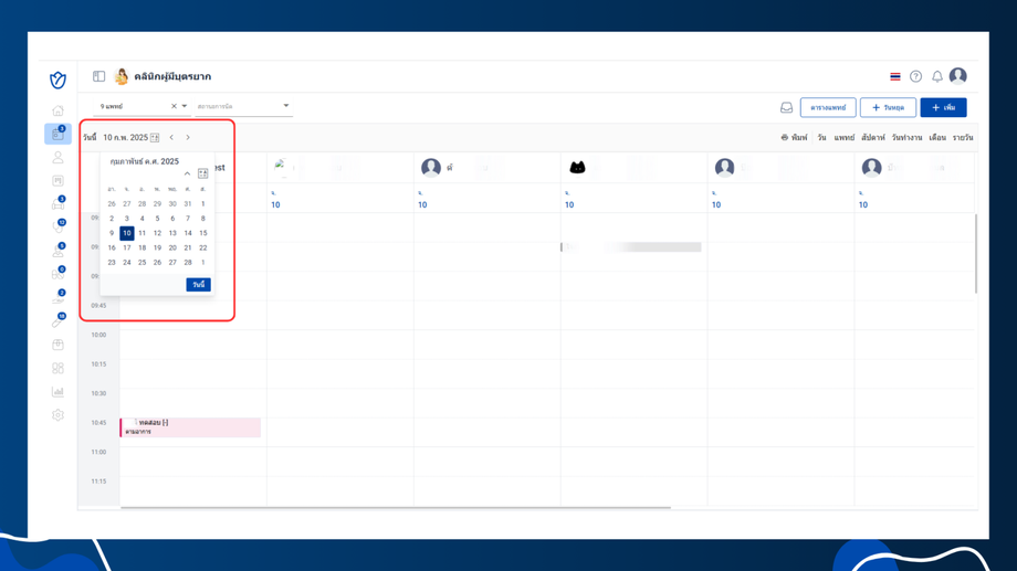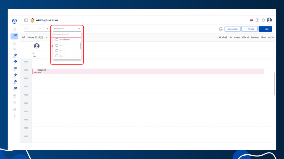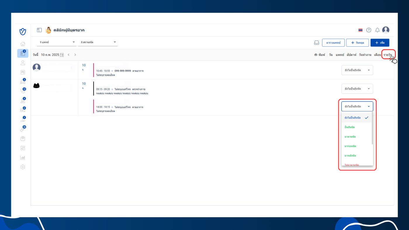 - สามารถกรองรายการนัดหมายตามสถานะ เช่น ยังไม่ยืนยันนัด หรือ ยืนยันนัด