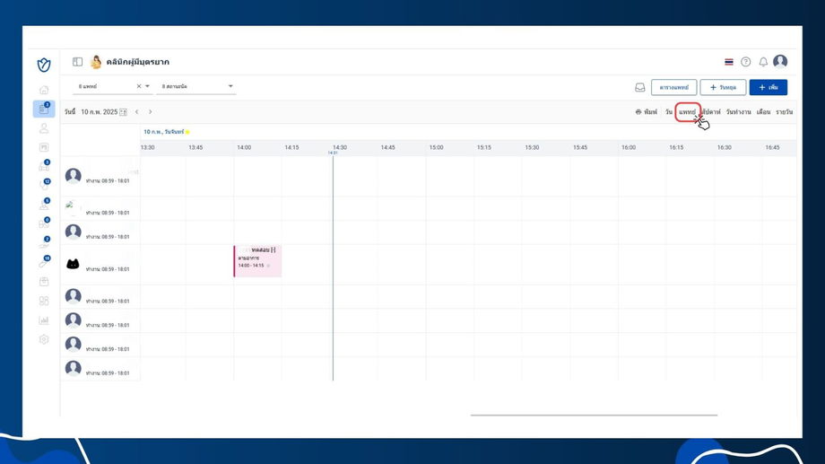 - ระบบจะแสดงเฉพาะแพทย์ที่มีตารางทำงานตรงกับวันที่ที่ผู้ใช้งานเลือก