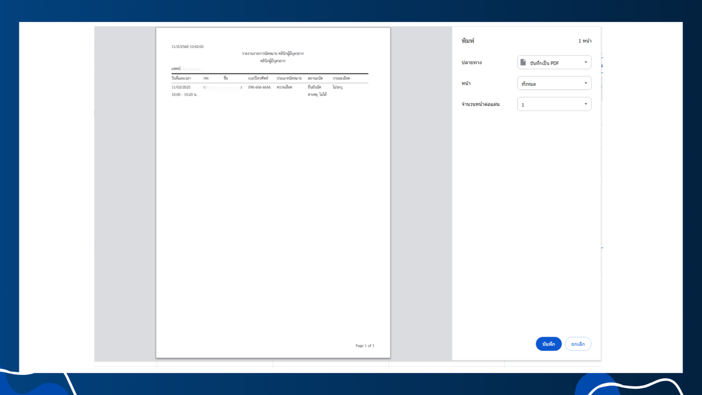 รายงานการนัดหมายจะแสดงข้อมูลชื่อแพทย์ วันที่และเวลา HN ชื่อเบอร์โทรศัพท์ ประเภทนัดหมาย สถานะนัด รายละเอียด
