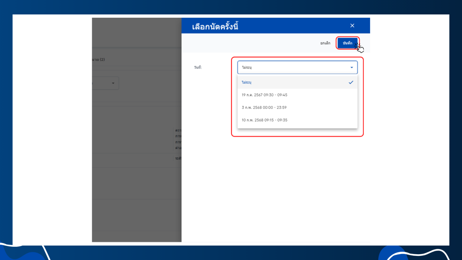 - ช่วงเวลา เลือกช่วงเวลาที่จะเข้าพบ