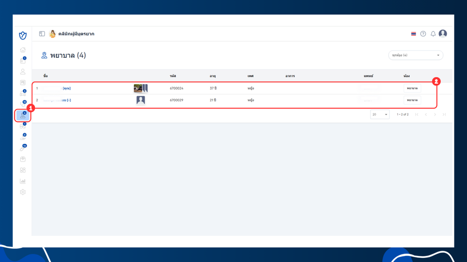 เป็นส่วนของพยาบาลเป็นการแสดงข้อมูลคนไข้การรักษาสำหรับคนไข้แต่ละคน พร้อมกรณีที่คนไข้เข้ารับการรักษาพร้อมกับ คู่สมรส หรือ บุคคลที่เกี่ยวข้องก็สามารถบันทึกการรักษาได้พร้อมกัน โดยสามารถ บันทึกข้อมูลได้ดังนี้