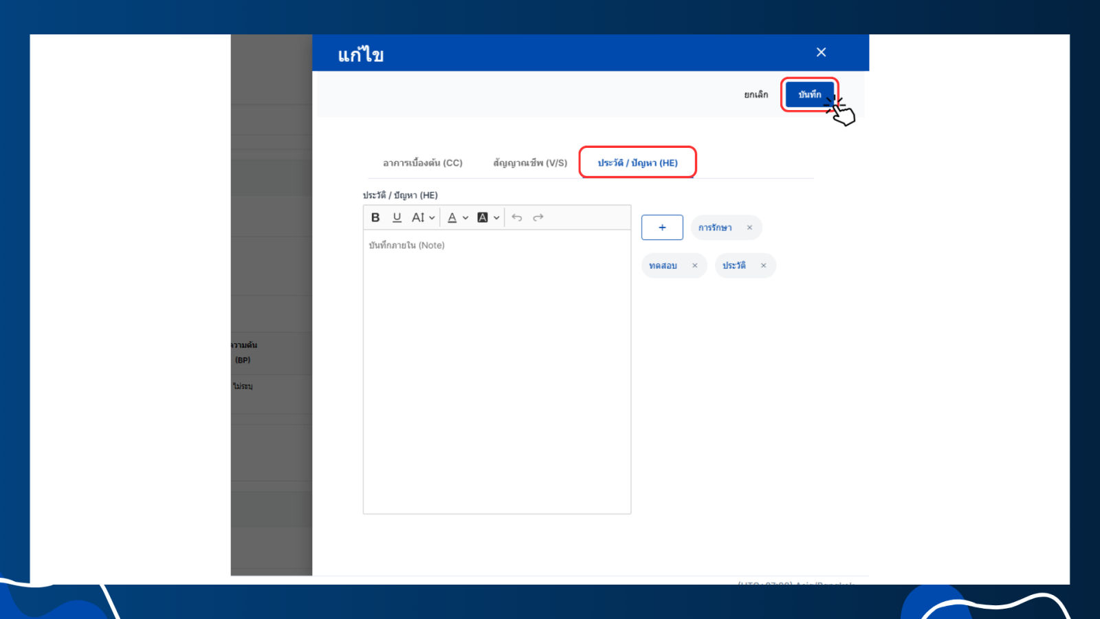 - สามารถเพิ่มหรือแก้ไขประวัติ/ปัญหา(HE) ได้ ประวัติเช่นเคยรักษามาก่อน