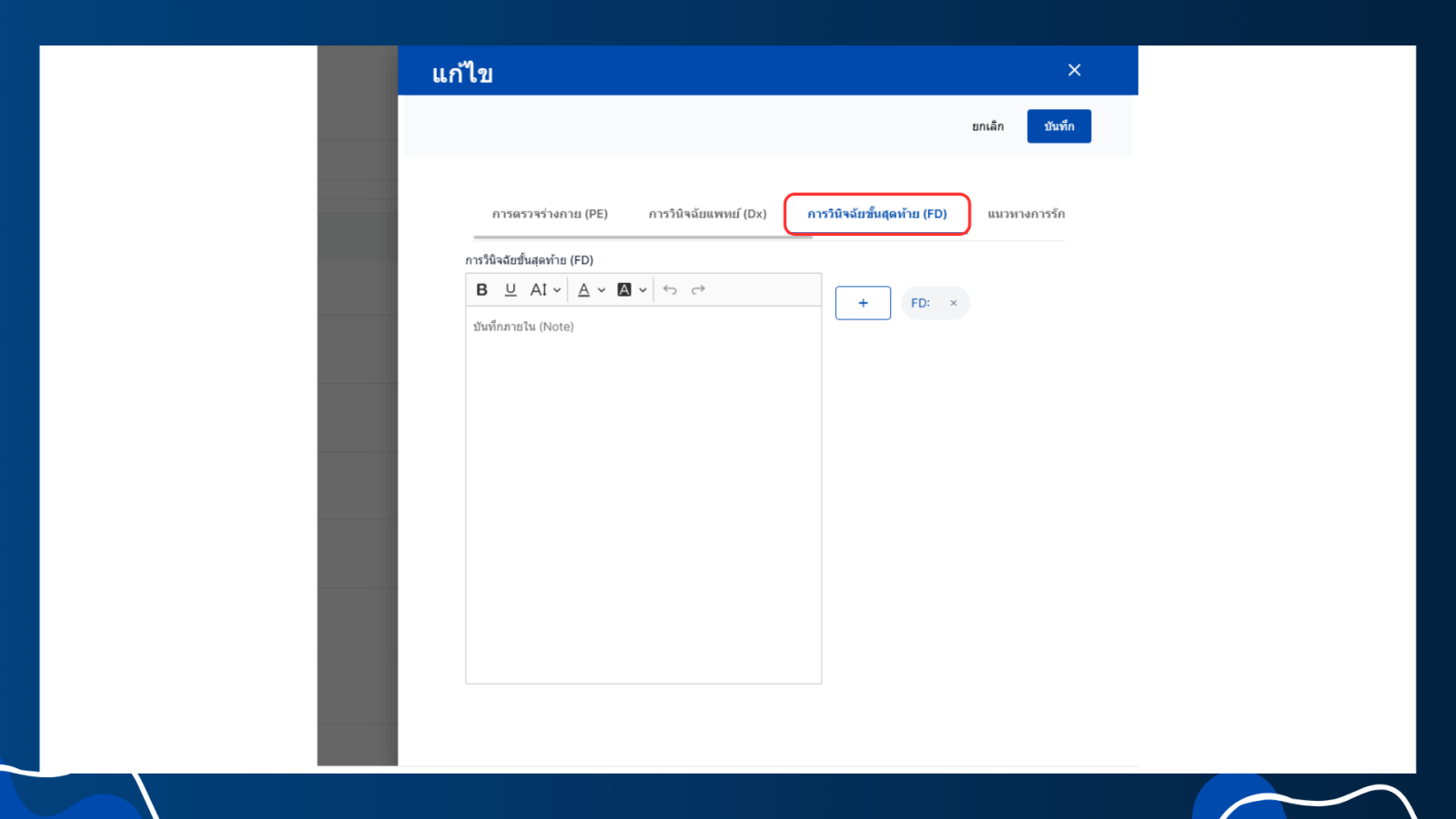 - สามารถเพิ่มหรือแก้ไขการวินิจฉัยขั้นสุดท้าย(FD)