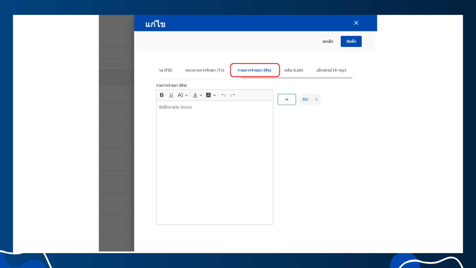 - สามารถเพิ่มหรือแก้ไข รายการจ่ายยา (Rx)