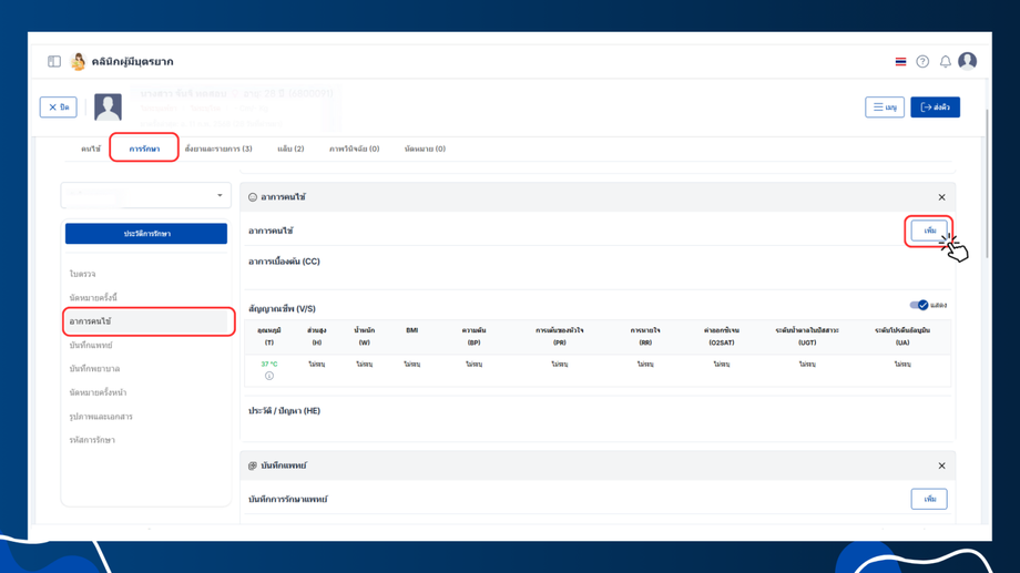 ในส่วนของอาการคนไข้จะมีอยู่3หัวข้อหลักคือ อาการเบื้องต้น (CC สัญญาณชีพ (V/S) ประวัติ / ปัญหา (HE) คลิกที่เพิ่ม