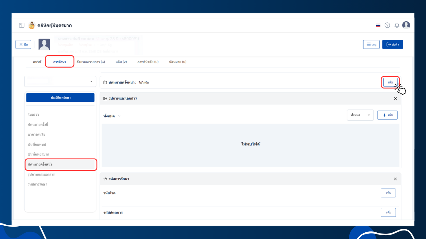 การนัดหมายครั้งหน้าที่จะเข้าพบแพทย์เพื่อทำการตรวจรักษาหรือติดตามอาการของคนไข้ คลิกที่ เพิ่ม