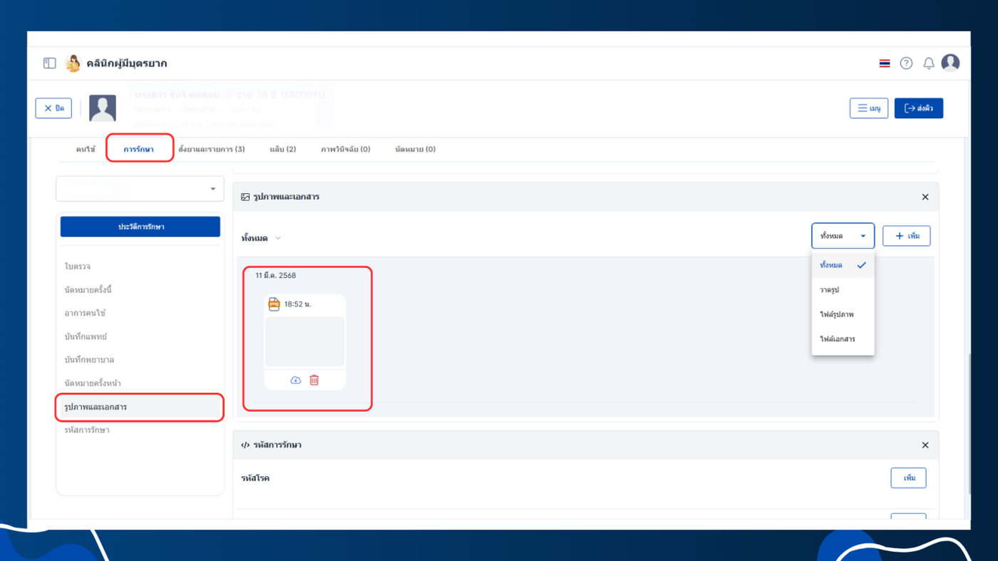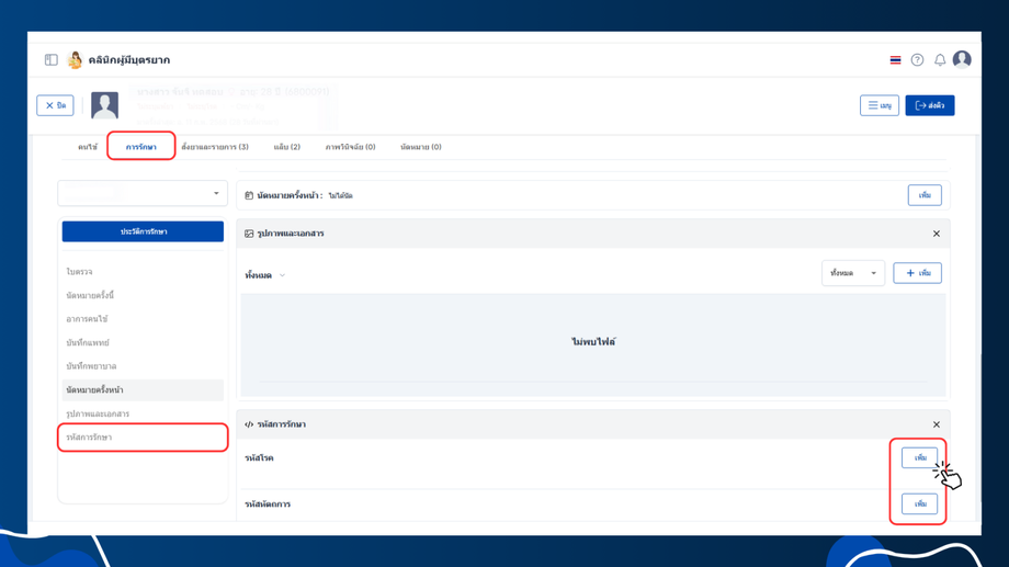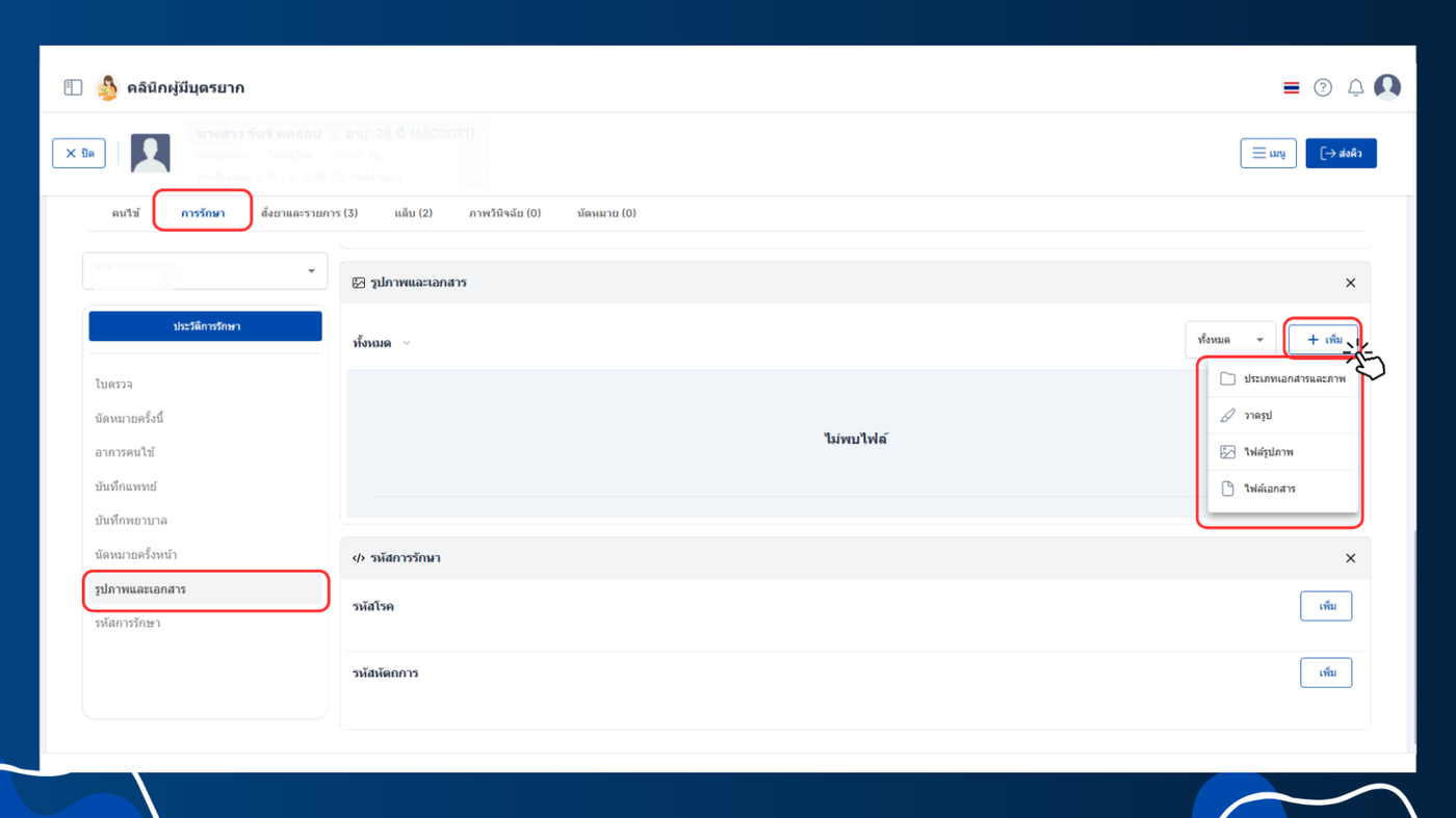 รูปภาพสามารถเพิ่มรูปภาพอาการคนไข้หรือไฟล์เอกสารได้ คลิกที่เพิ่ม