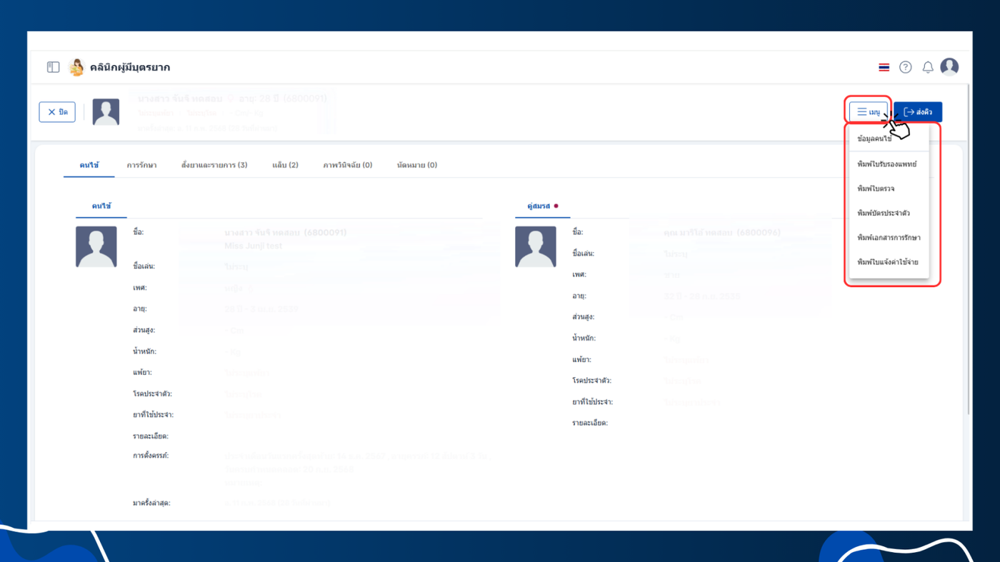 ในส่วนนี้จะสามารถเลือกแพทย์และพยาบาลผู้ดูแลได้และสามารถ เพิ่มใบตรวจได้โดยคลิกที่ใบตรวจ