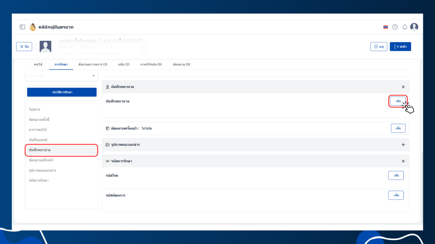 - สามารถเพิ่มหรือแก้ไขได้แต่แพทย์ไม่สามารถเพิ่มแก้ไขหรือบันทึกได้ในส่วนของบันทึกพยาบาล
