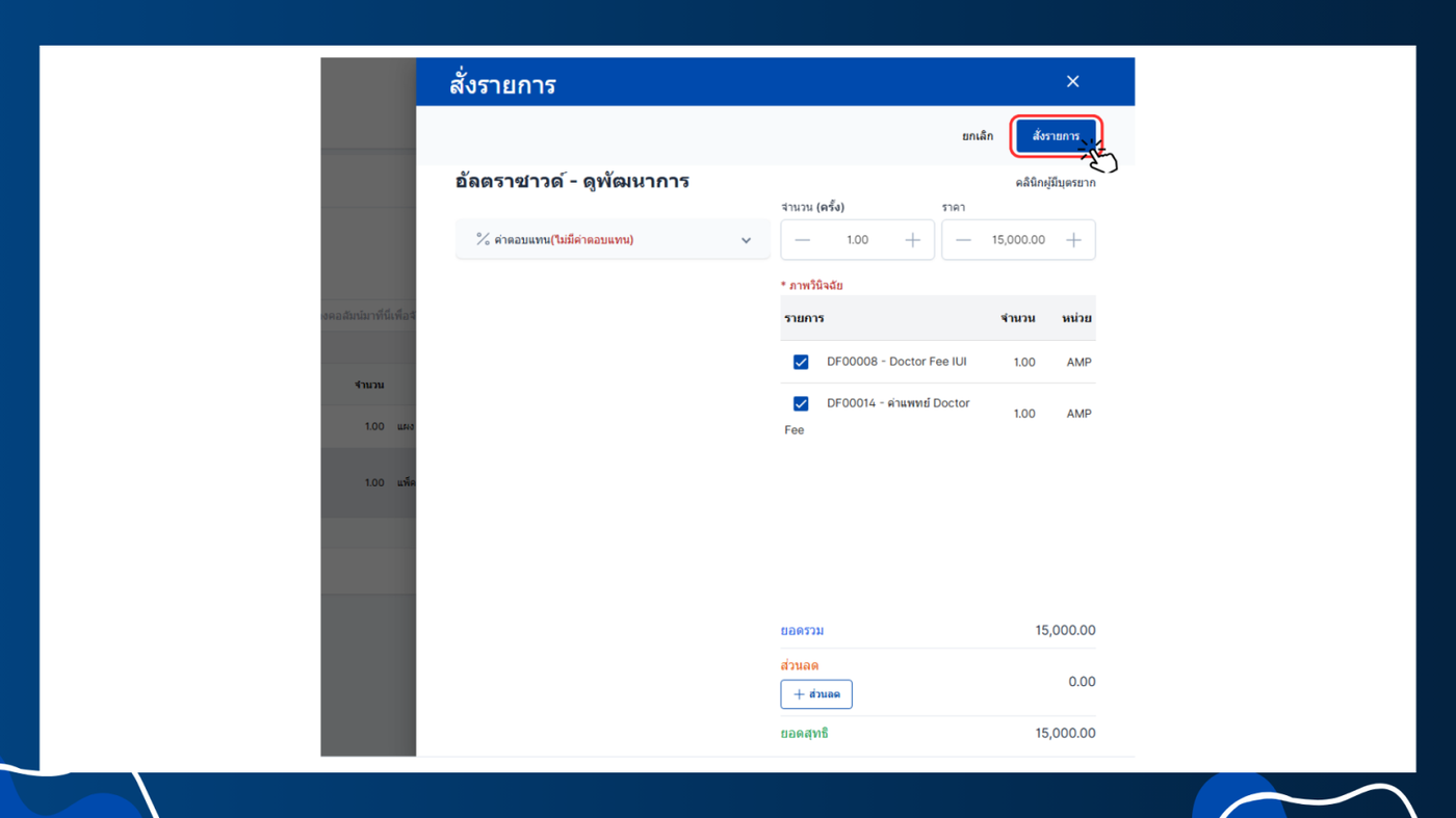 เมื่อสั่งรายการจากหน้าสั่งยาและรายการแล้วจะมาแสดงที่หน้าวินิจฉัยจากนั้นทำตามขั้นตอนดังนี้