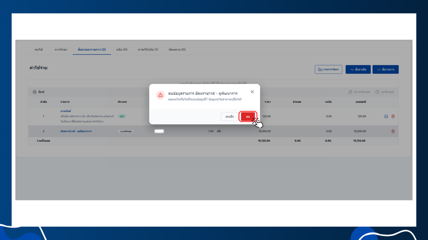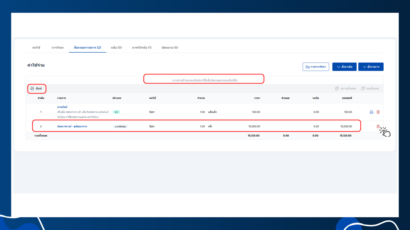 - เมื่อกดบันทึกรายการที่ได้ทำการสั่งรายการสินค้าก็จะไปแสดงที่ ค่าใช้จ่ายให้คุณ โดยจะแสดงรายการที่สั่ง ประเภท ชื่อคนไข้ จำนวน ราคา ส่วนลด วงเงิน ยอดสุทธิ