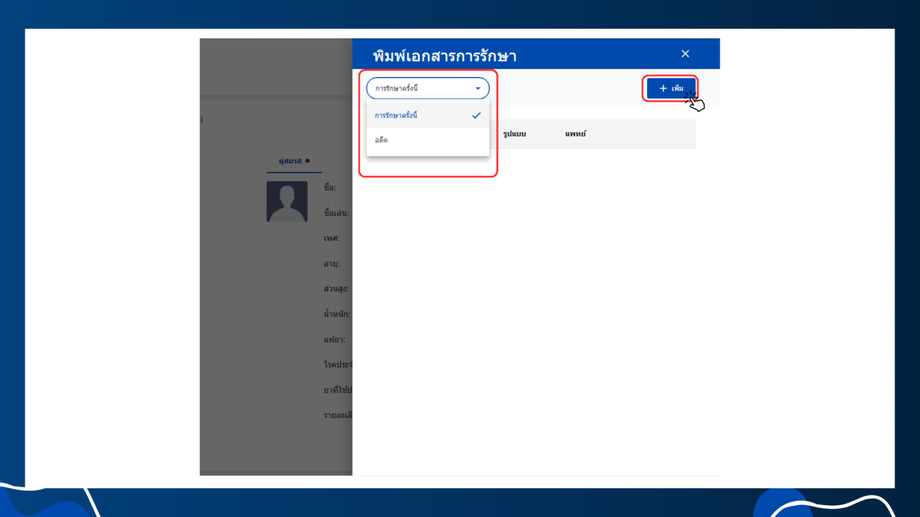- พิมพ์เอกสารการรักษาสามารถเลือกได้ว่าจะพิมพ์การรักษาครั้งนี้หรืออดีต