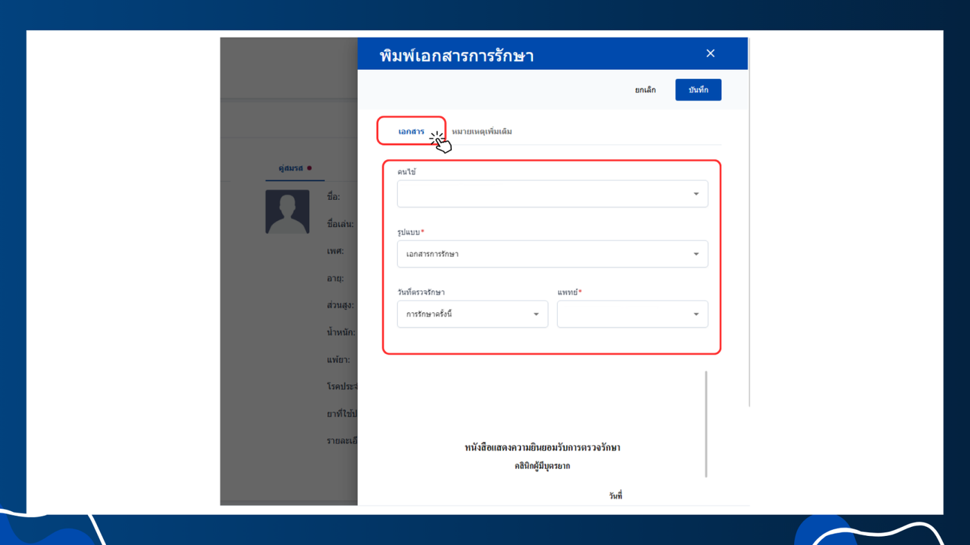 - สามารถเลือกรูปแบบ ใบรับรองแพทย์