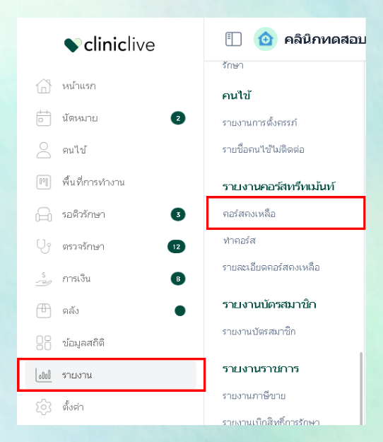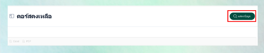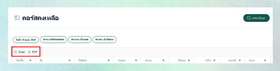รายงานข้อมูลคอร์สคงเหลือเป็นเอกสารที่สร้างขึ้นเพื่อแสดงข้อมูลเกี่ยวกับคอร์สที่ยังคงเหลือในระบบ ณ วันที่ทำรายงาน