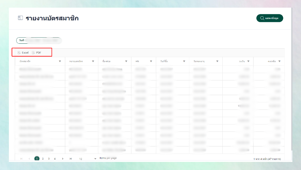 รายงานบัตรสมาชิก เป็นการสรุปข้อมูลการใช้บัตรสมาชิกไว้ในรูปแบบรายงาน โดยในหน้ารายงานจะมีข้อมูลชื่อบัตรสมาชิก หมายเลขบัตร ชื่อผู้ใช้ เลข HN วันที่ซื้อบัตร วันบัตรหมดอายุ วงเงิน และวงเงินคงเหลือ จึงทำให้สามารถดูข้อมูลได้ง่ายขึ้น และการเข้าดูข้อมูลรายงานสามารถทำได้โดยการ คลิกแสดงข้อมูล