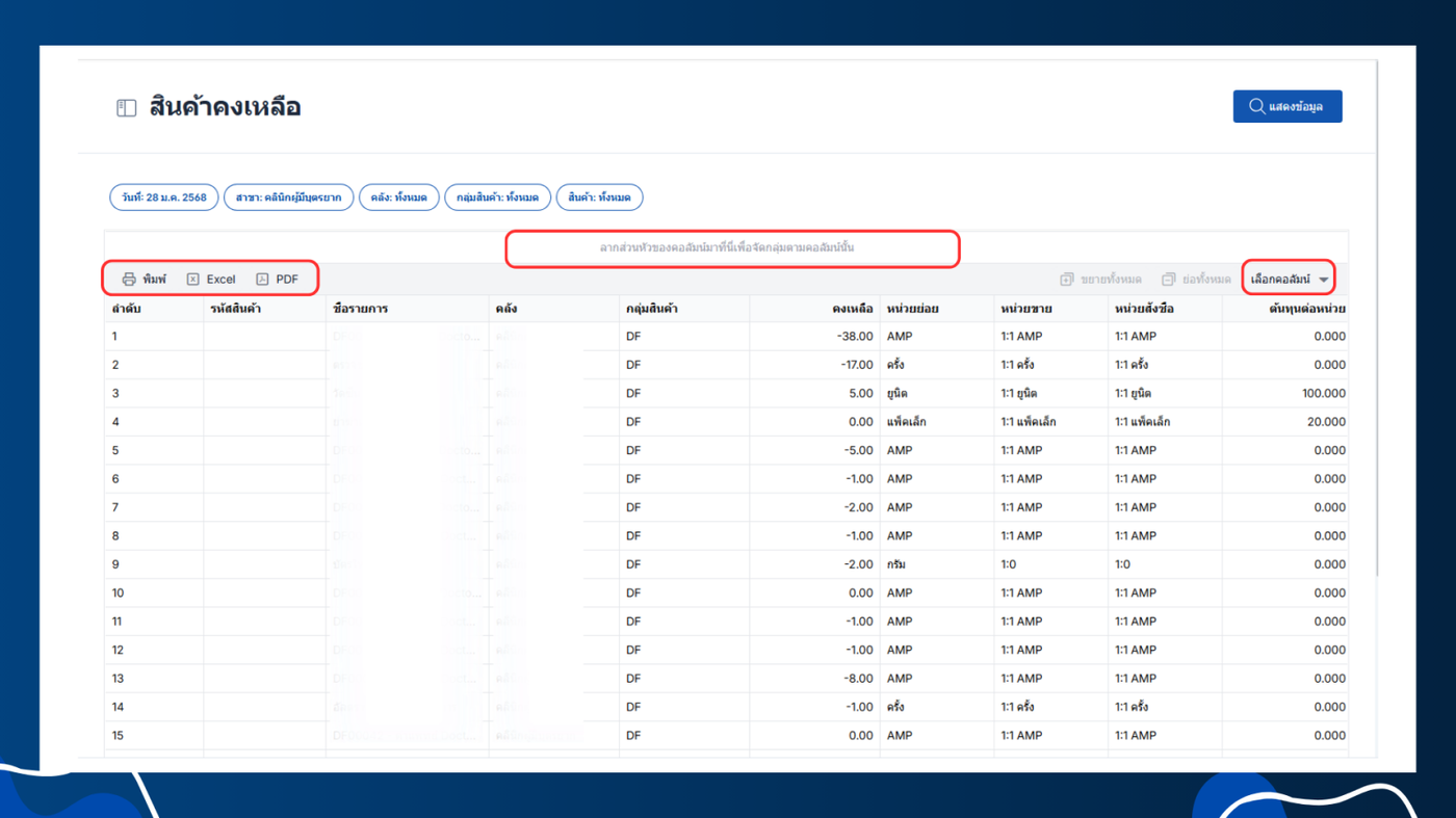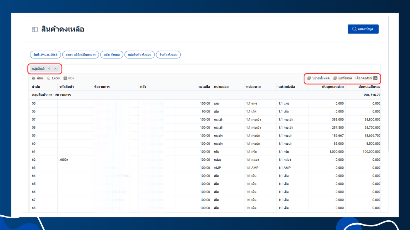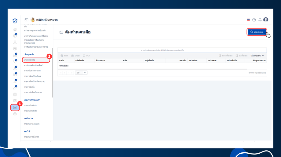 - เลือกหัวข้อข้อมูลคลัง > สินค้าคงเหลือ